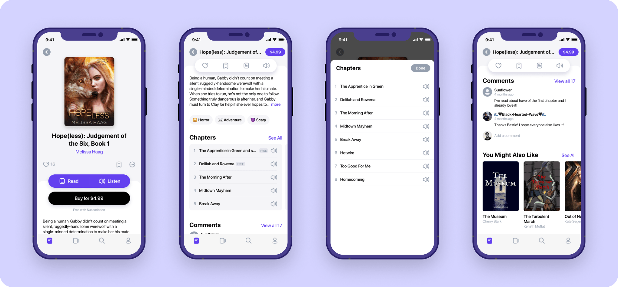 The book screen shows you everything you need to know about the book - from its description and genre, to its chapters and comments from other readers. You can dive right in and start reading or listening, add it to your list of favorites for later, or show your love by clicking the heart button.