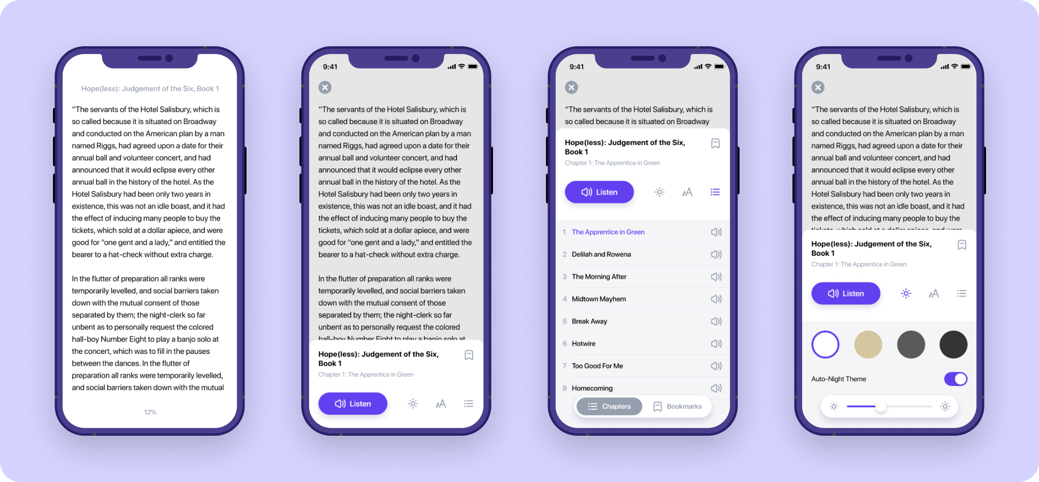While on the reading screen, simply tap the screen to access a menu with options such as settings, chapters, bookmarks, and the ability to start listening to the current page.