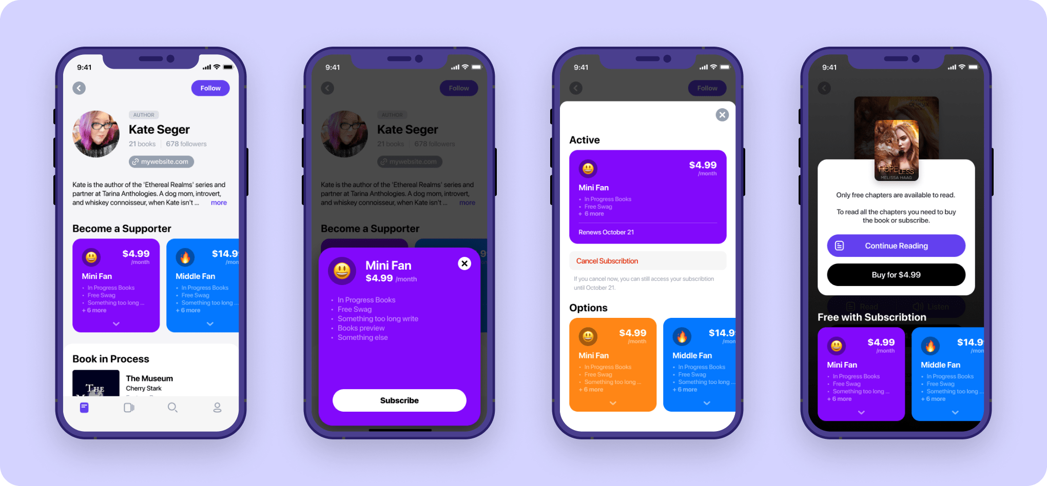 Discover the author's profile and select a subscription to gain access to their collection of books. The user can cancel or change their subscription at any time. If the user runs out of free chapters, they can easily subscribe or purchase the book to continue reading.